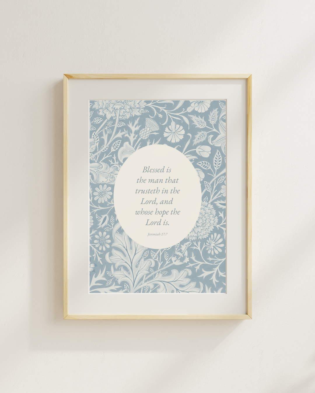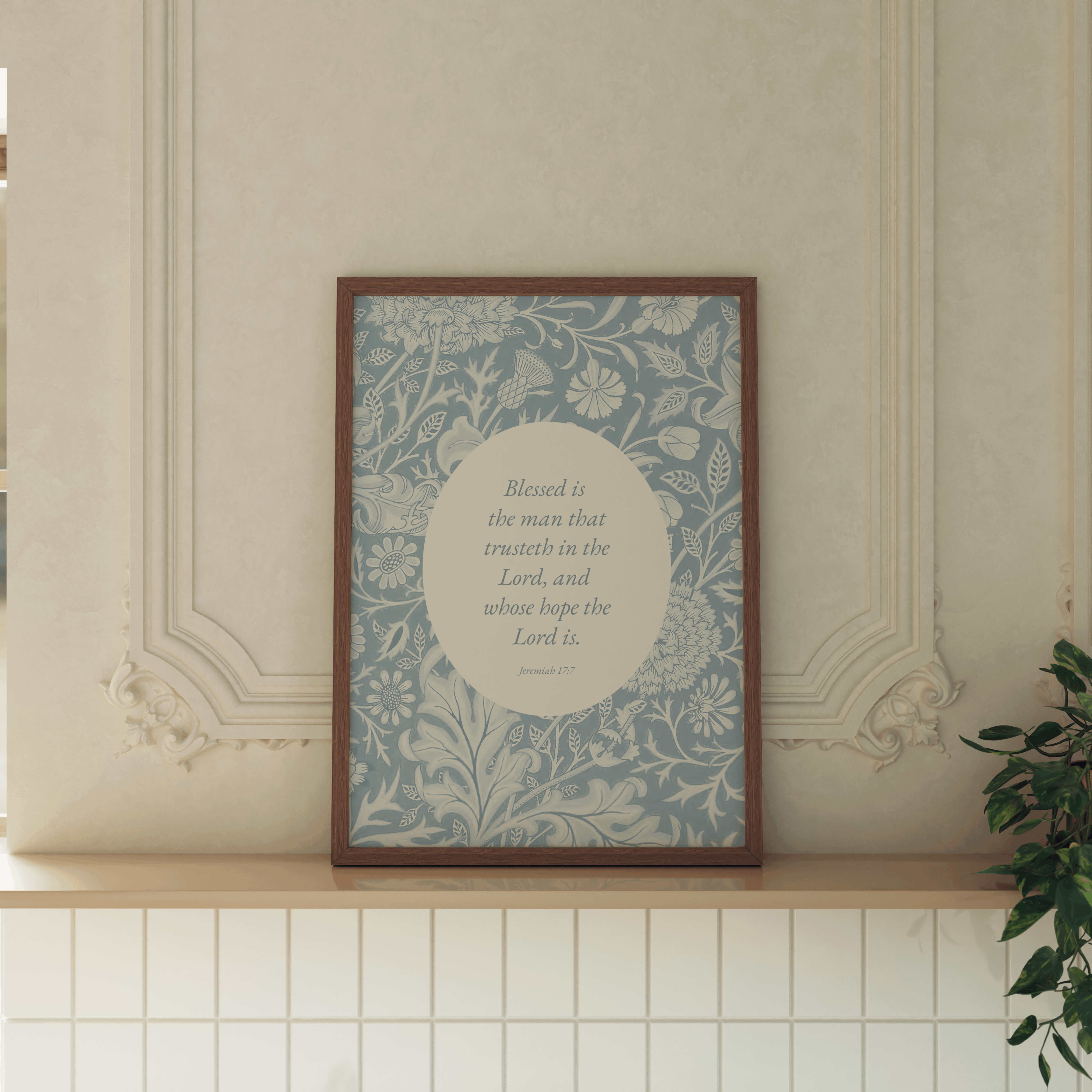 This print features a gorgeous vintage illustration paired with the words of Jeremiah 17:7 -"Blessed is the man that trusteth in the Lord, and whose hope the Lord is." -Jeremiah 17:7