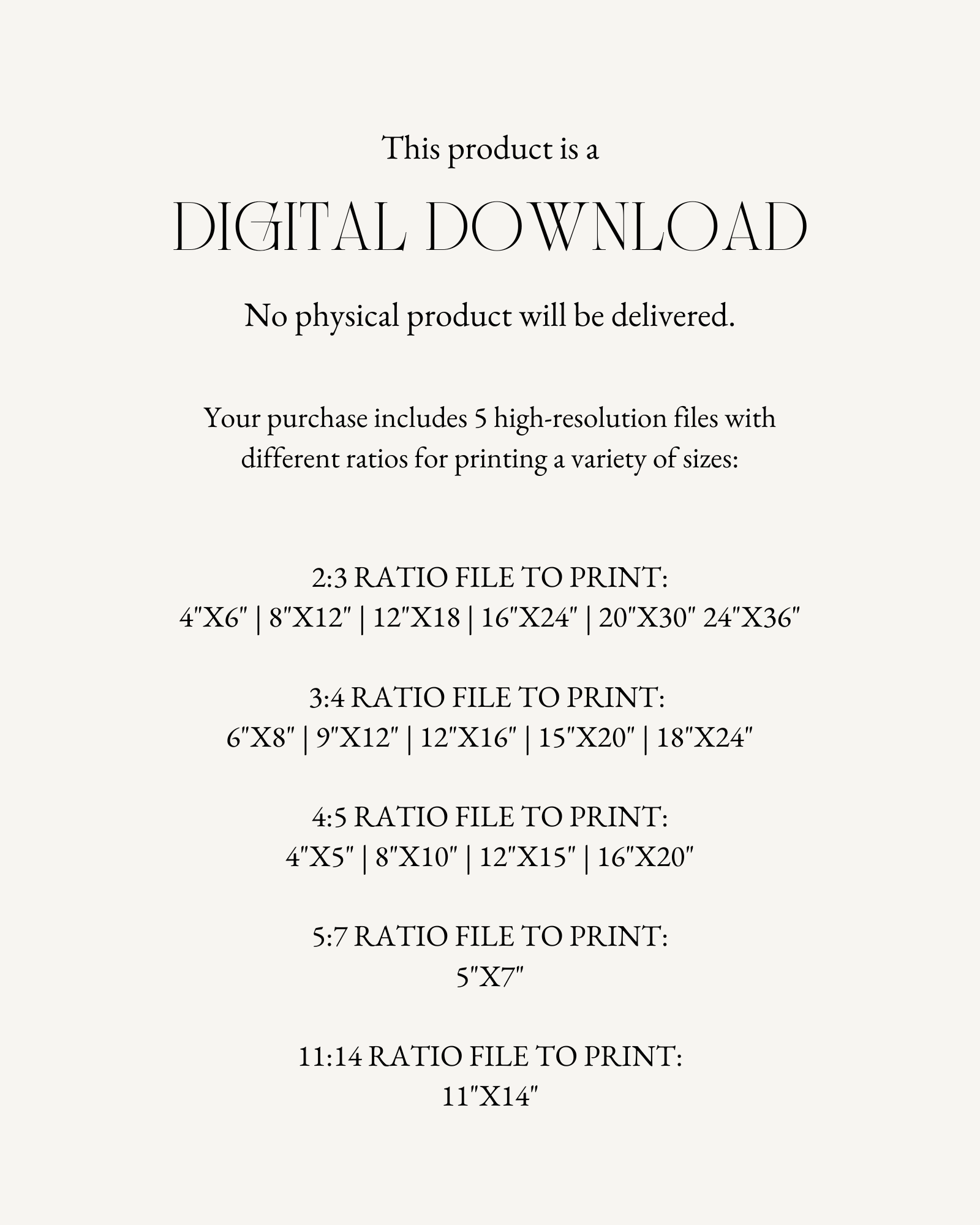 Download the file and print at home or your local office store. No physical product will be mailed to you. After completing your purchase, you will receive an email link where you will be directed to the downloadable JPG file.