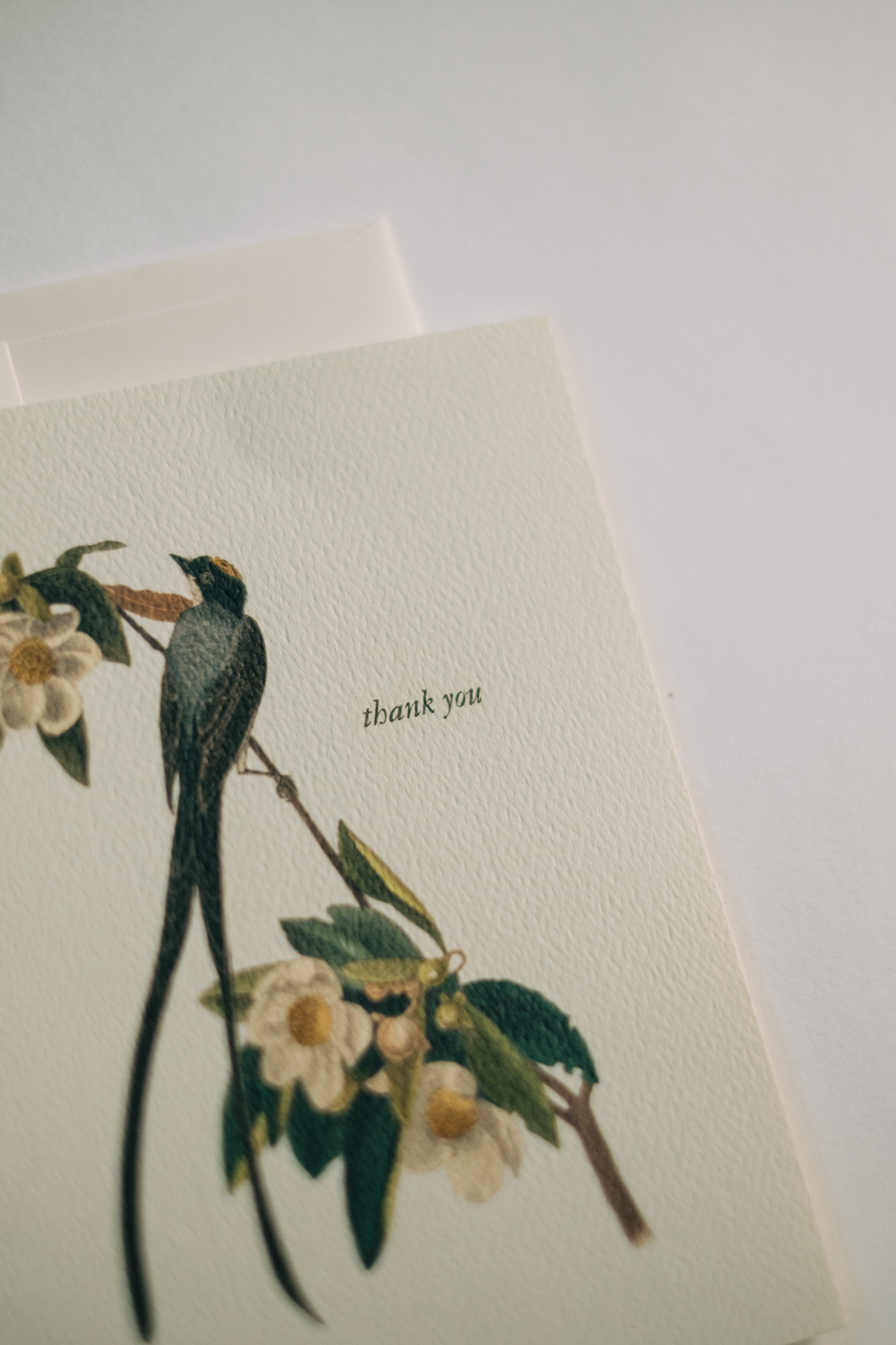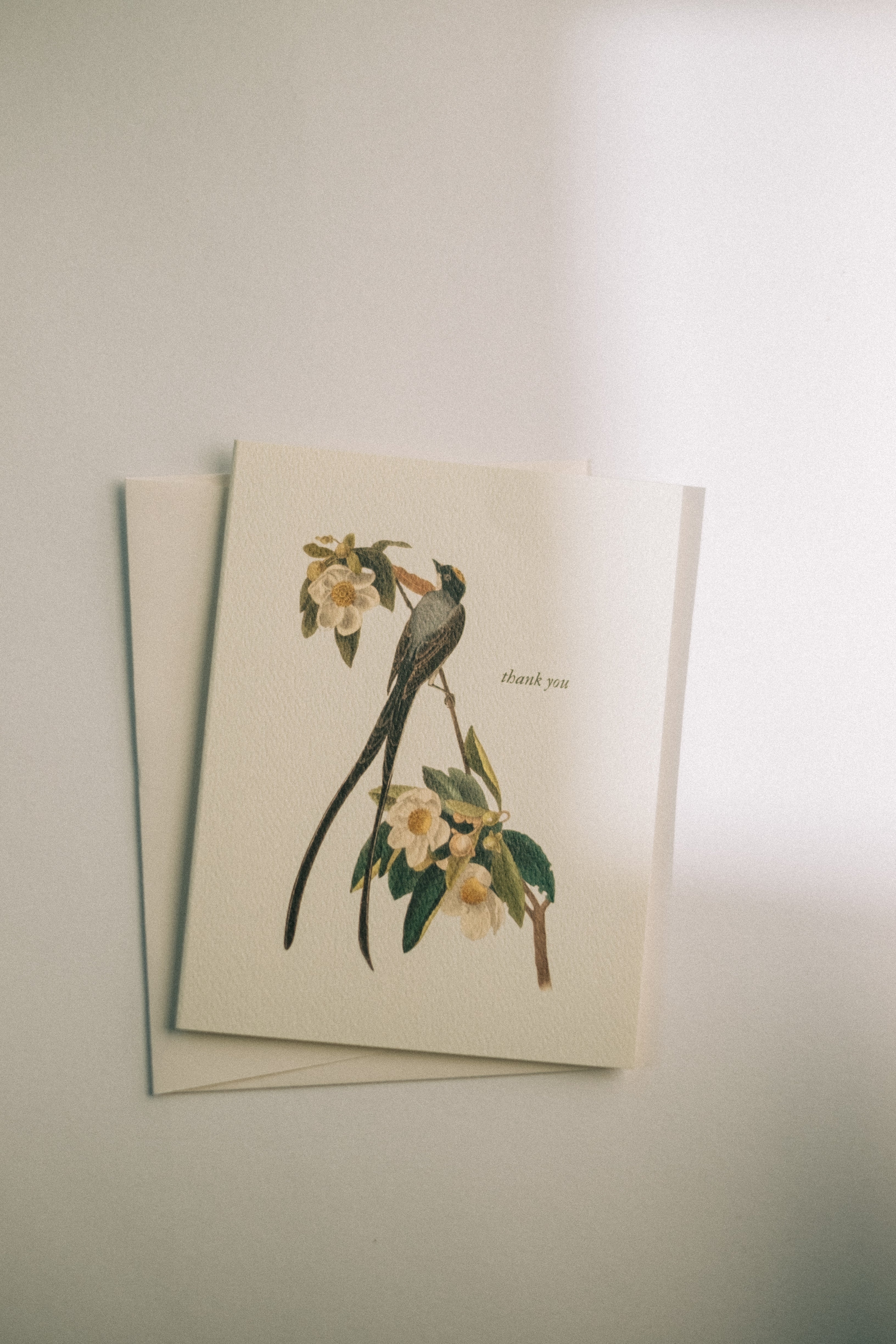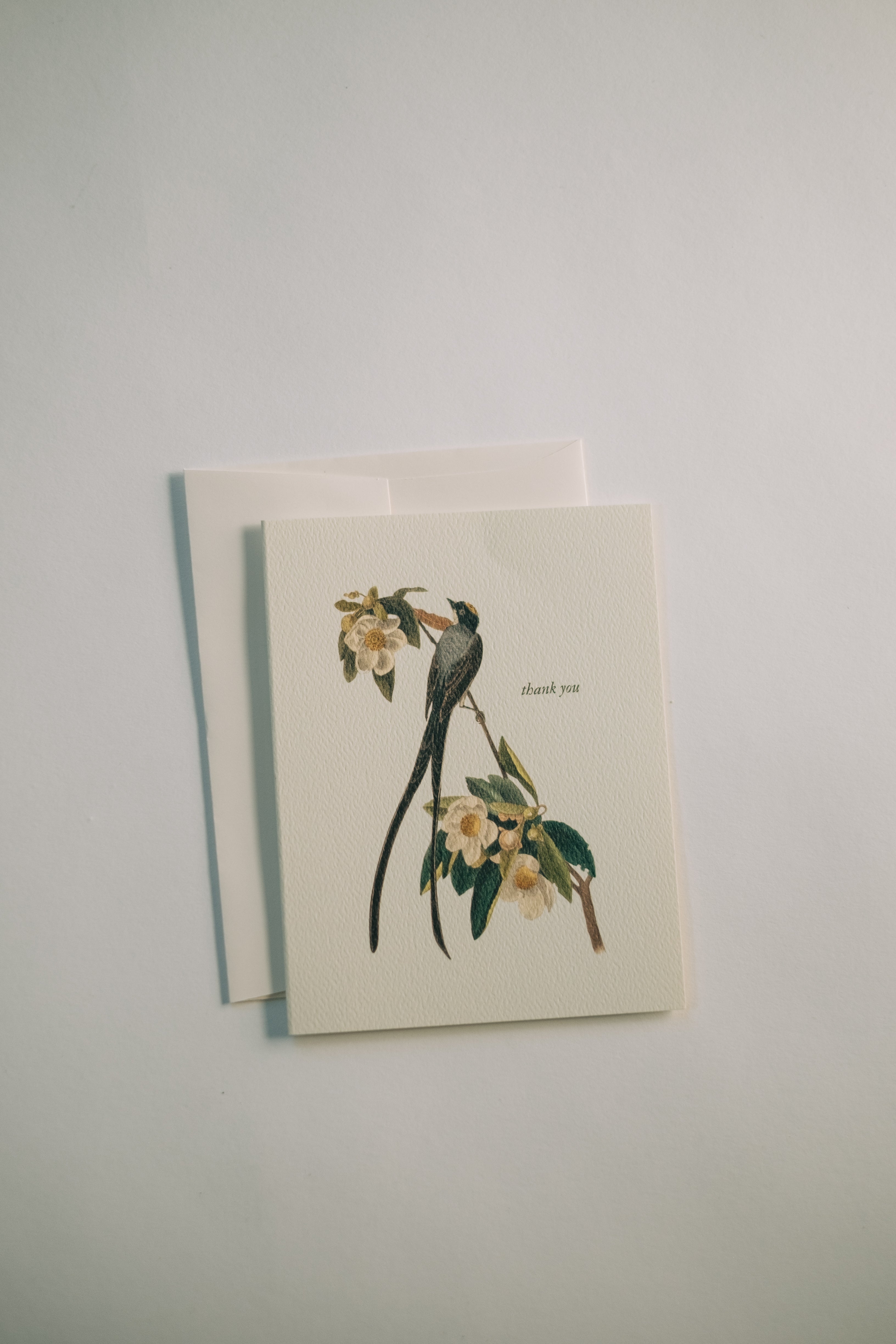 Set of six matching note cards with a simple "Thank You" on a beautiful vintage painting of a flycatcher on a branch