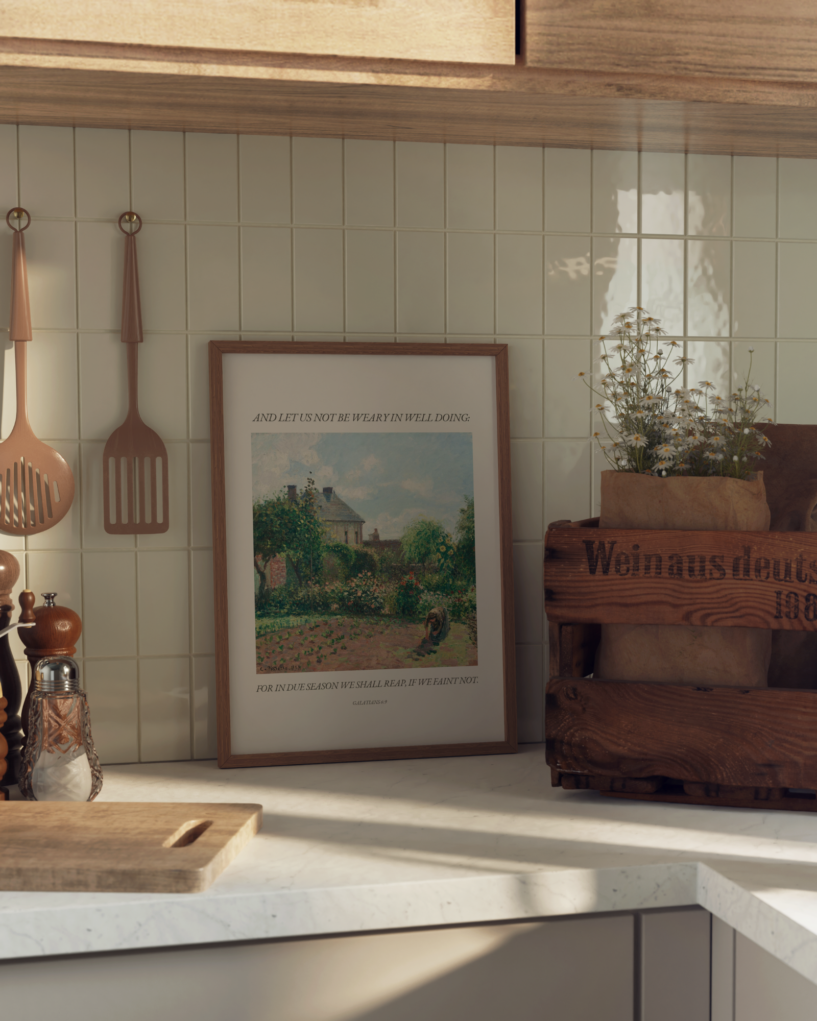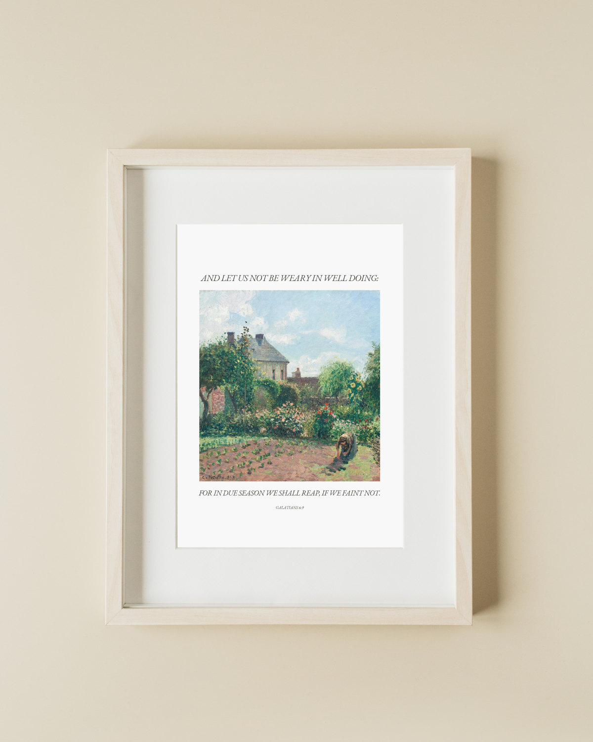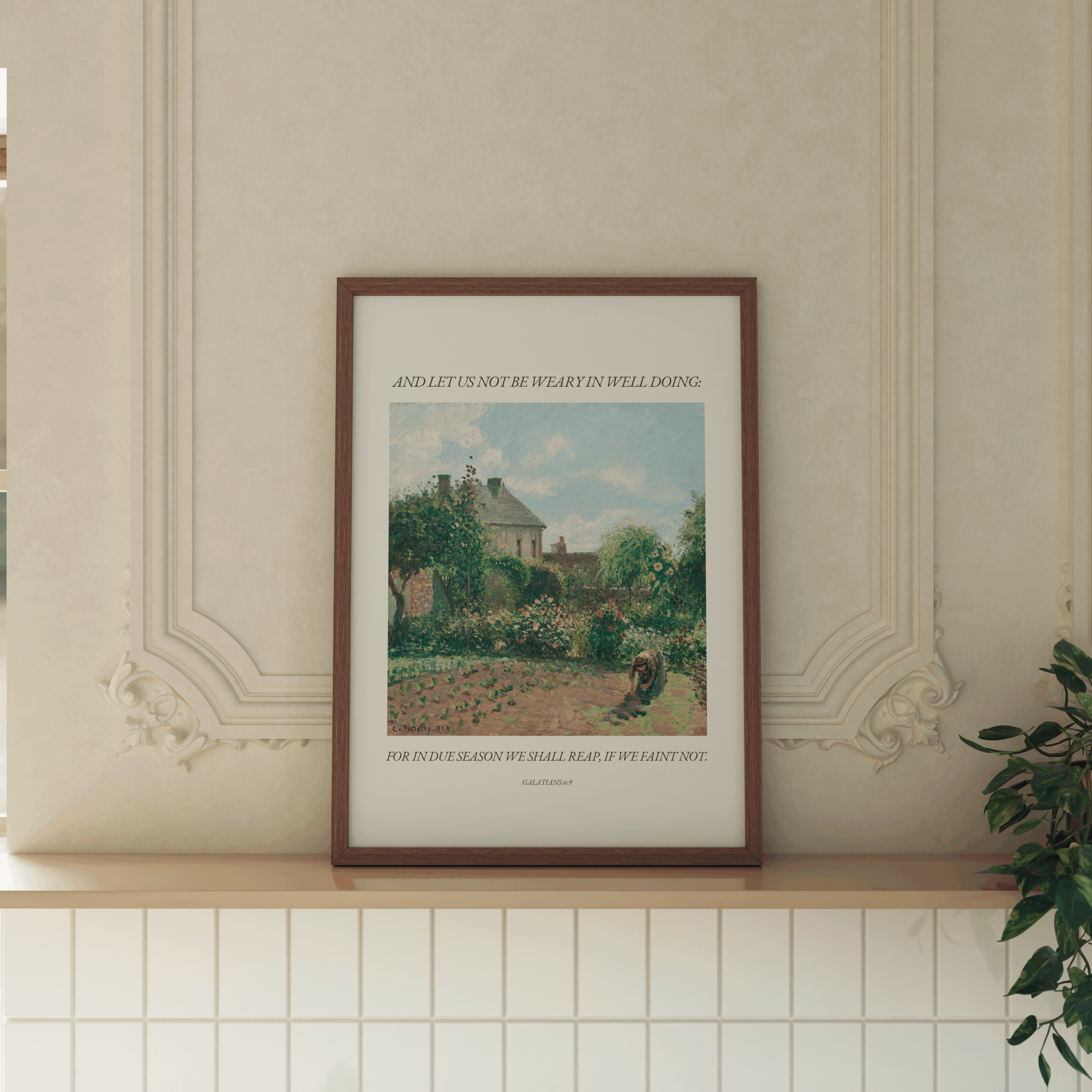 This beautiful reminder from Galatians 6:9, "And let us not be weary in well doing: for in due season we shall reap, if we faint not," is combined with a vintage painting to create a timeless piece of art for your home.