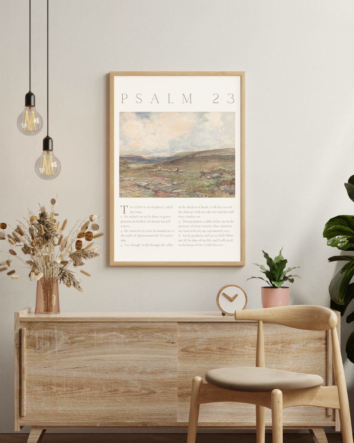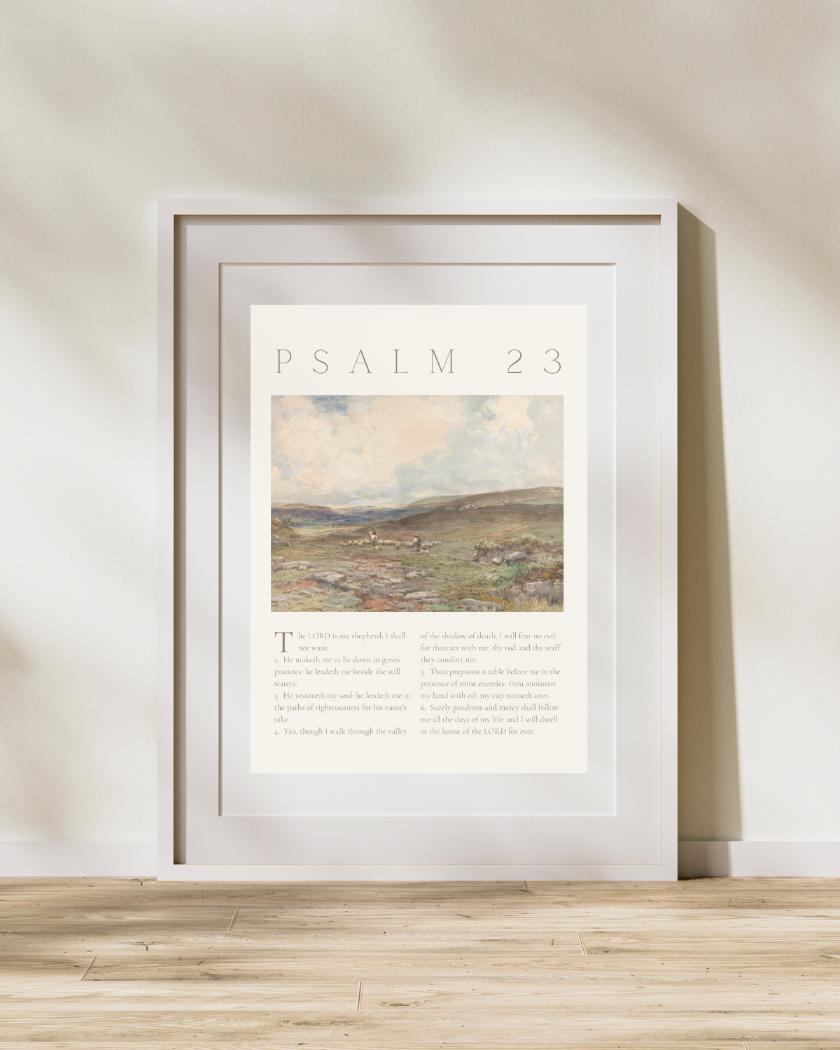 The words of Psalm 23 are combined with a vintage painting to create a timeless piece of art for you home.