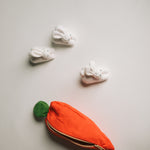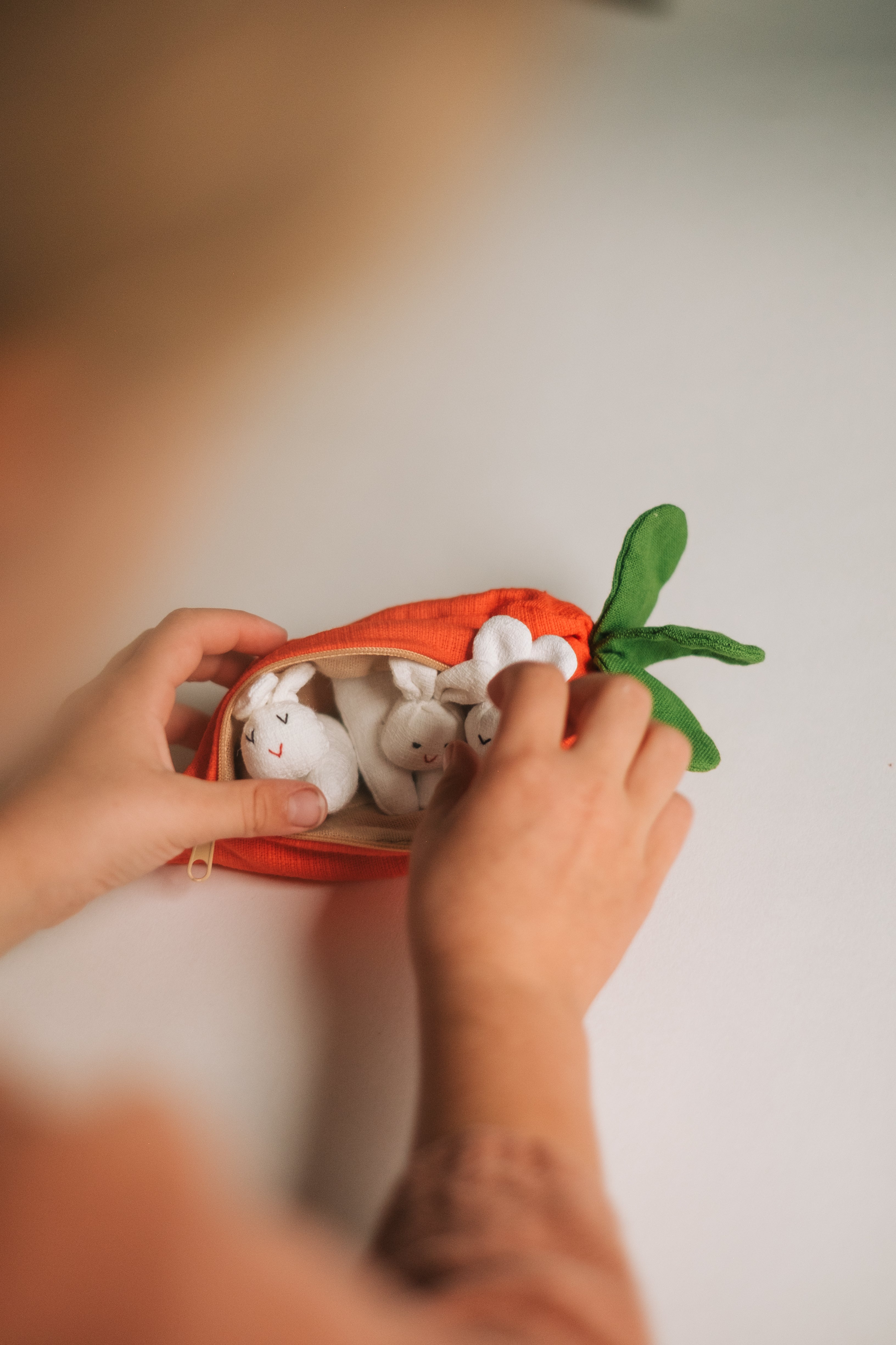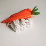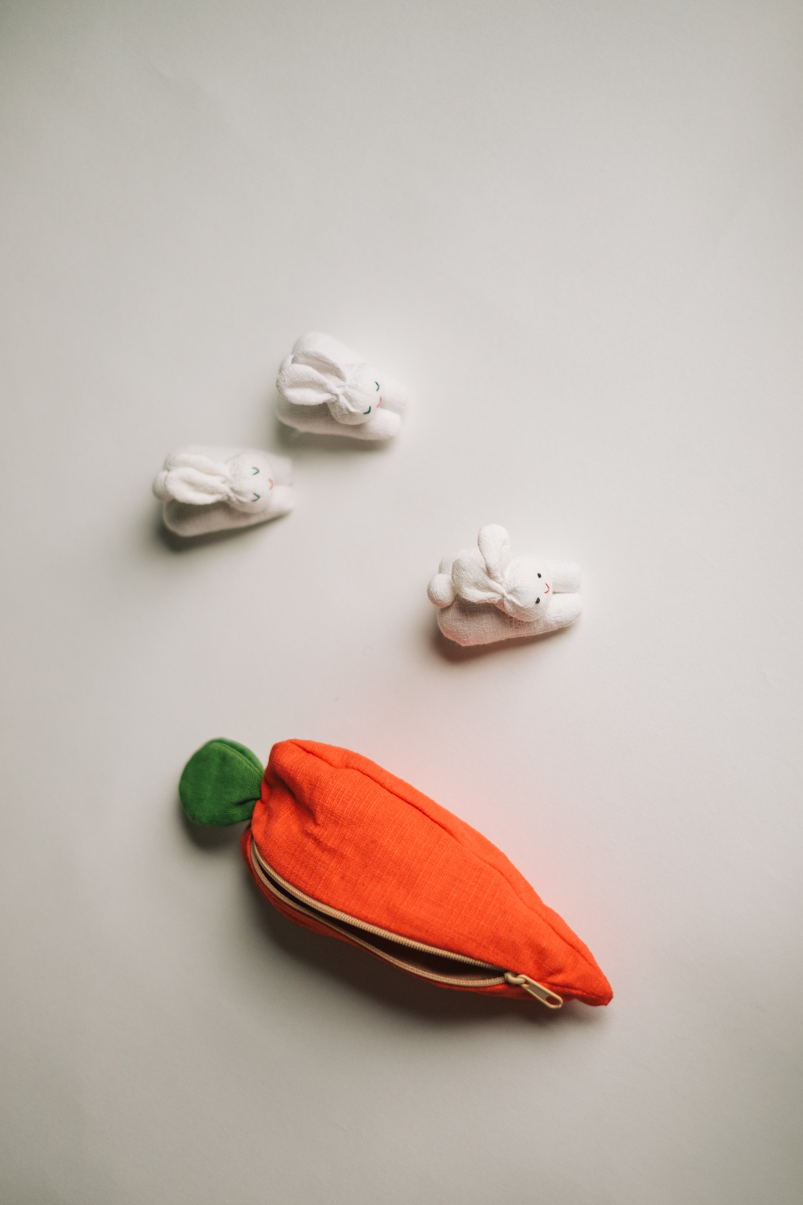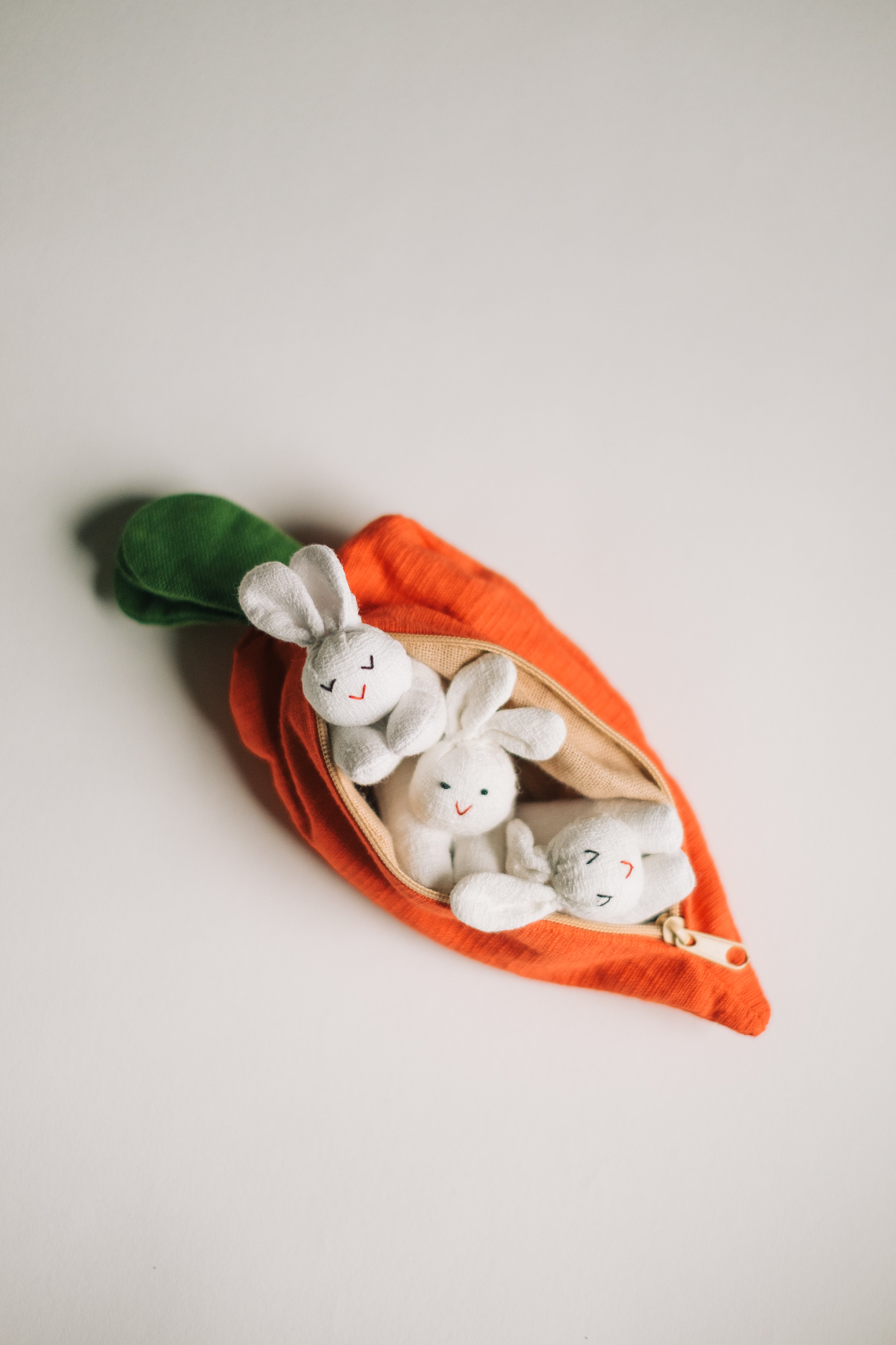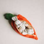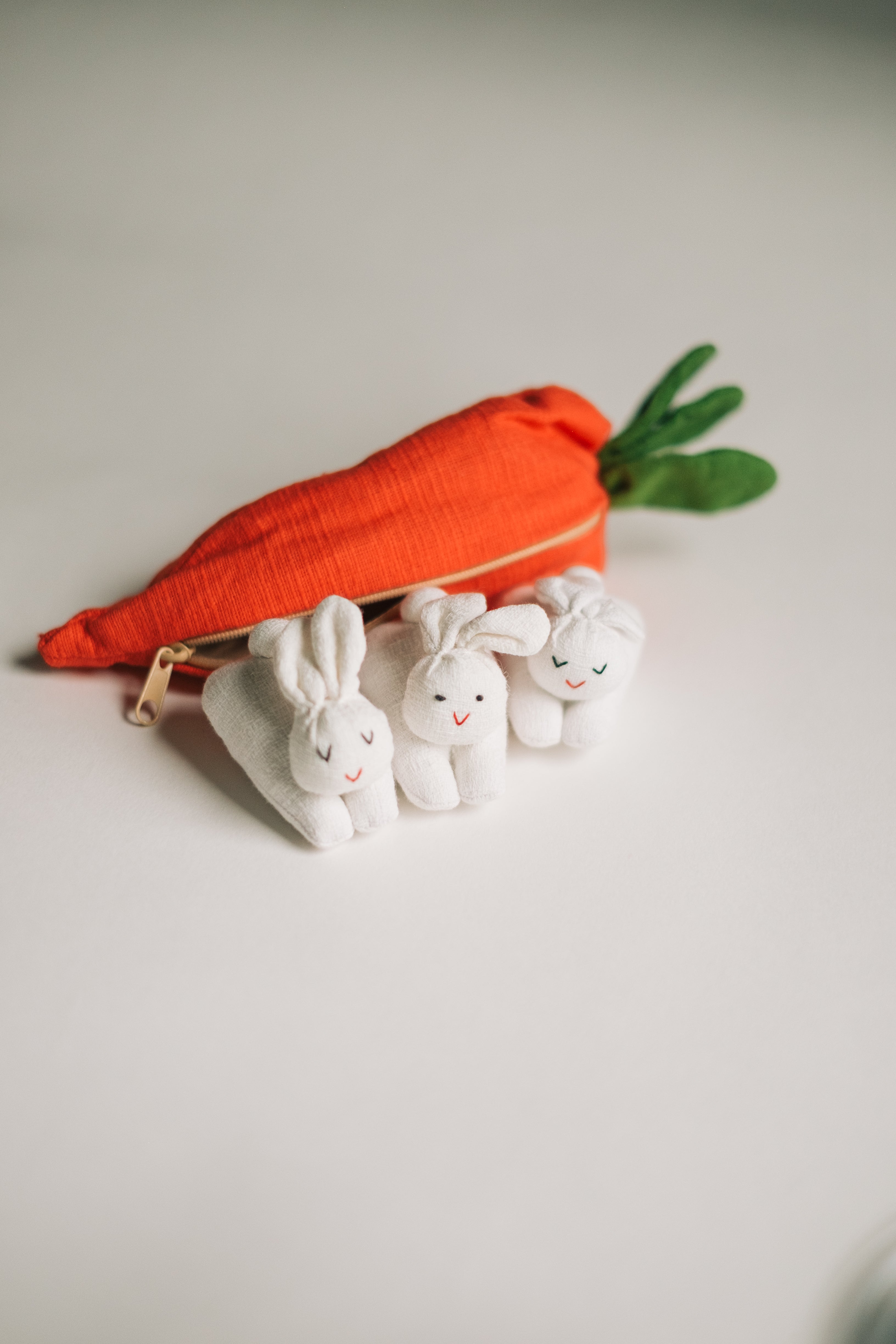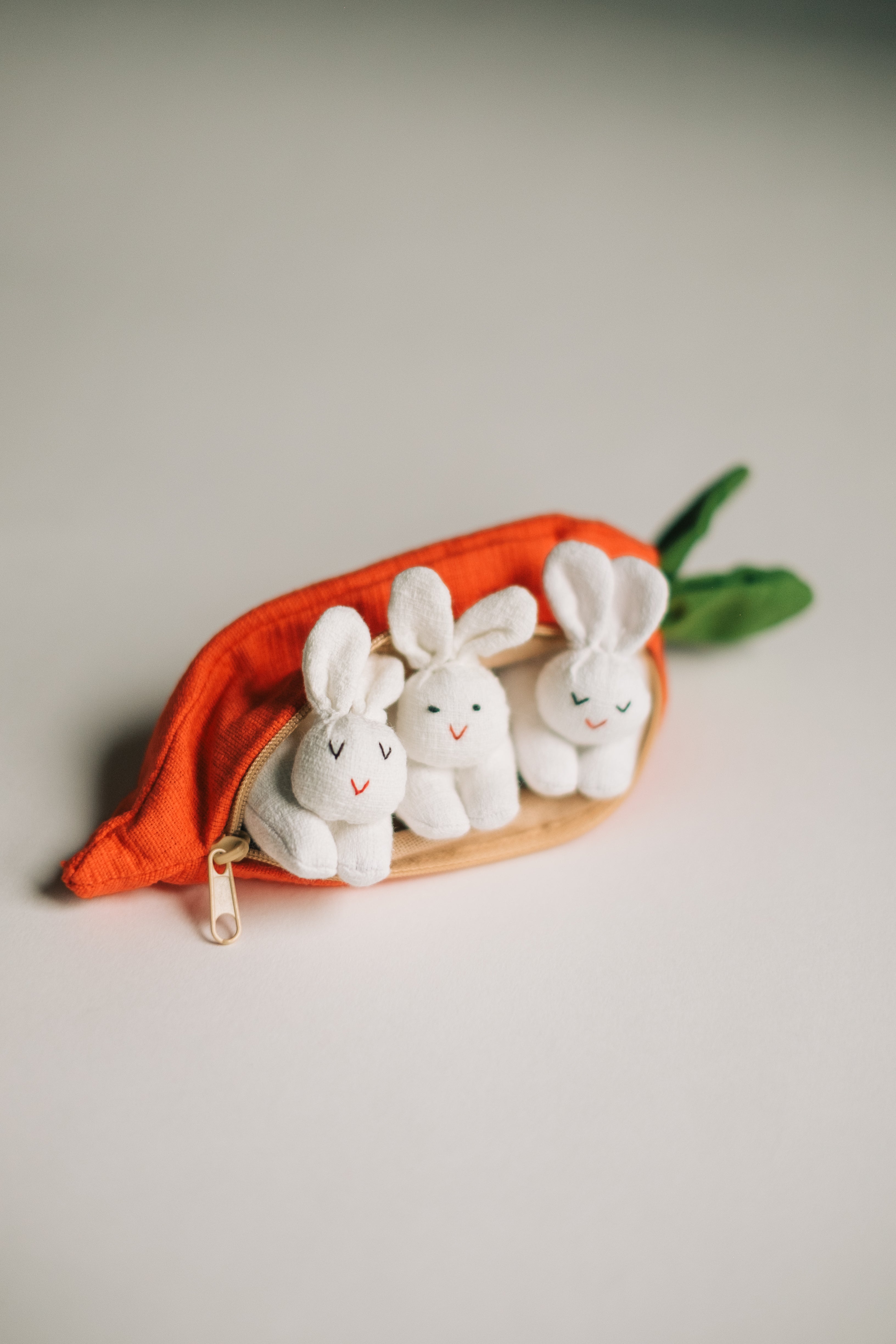 This darling set of three white cloth rabbits in a carrot zipper pouch was handmade by ladies in a Thai village. Perfect for church, travel, or other times when you need a quiet toy for your child.